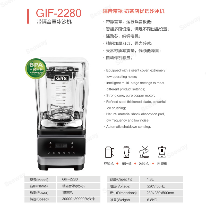 - Gifftt吉福士商用奶茶店带罩隔音静音刨破冰碎冰榨汁机GIF-2280